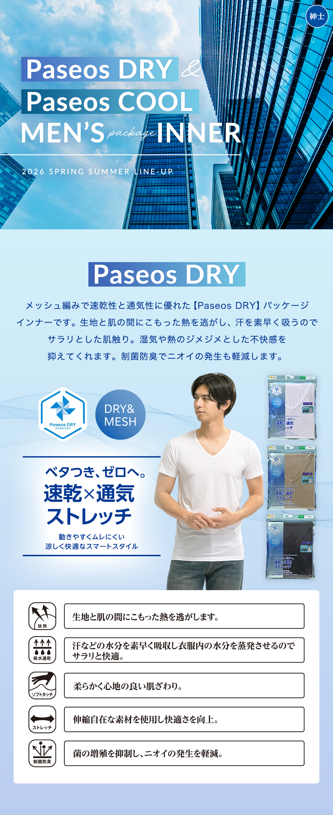 ~【Paseos DRY】のDRYメッシュインナー。動きやすくムレにくい、涼しく快適なスマートスタイル~【速乾×通気ストレッチ】(メッシュ編み)(放熱)(吸水速乾)(制菌防臭)メンズパッケージインナーサイズ:M・L・LL商品番号:71-622-670-01~