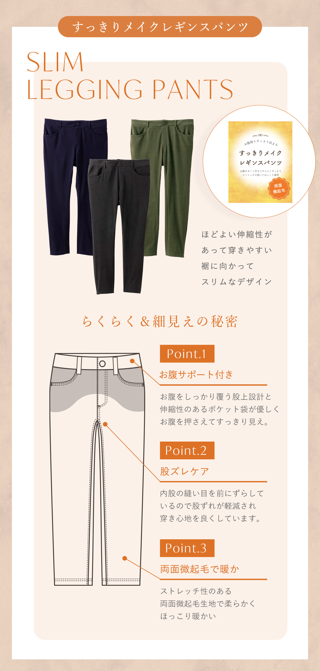 ~ほどよい伸縮性があって穿きやすい、裾に向かってスリムなデザイン、穿くだけで美脚になれる。~