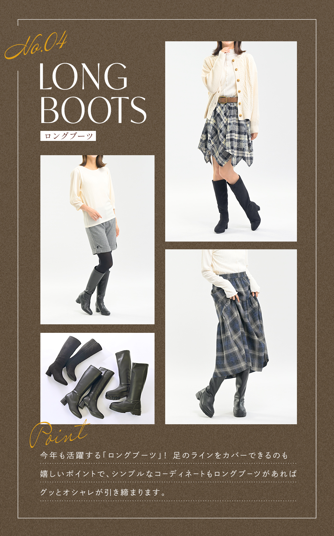 ~履き心地の良いストレッチ素材を用いたロングブーツ♪ボリューム感のあるアウトソールで、カジュアルな装いからキレイめな服装でも相性がピッタリ。~