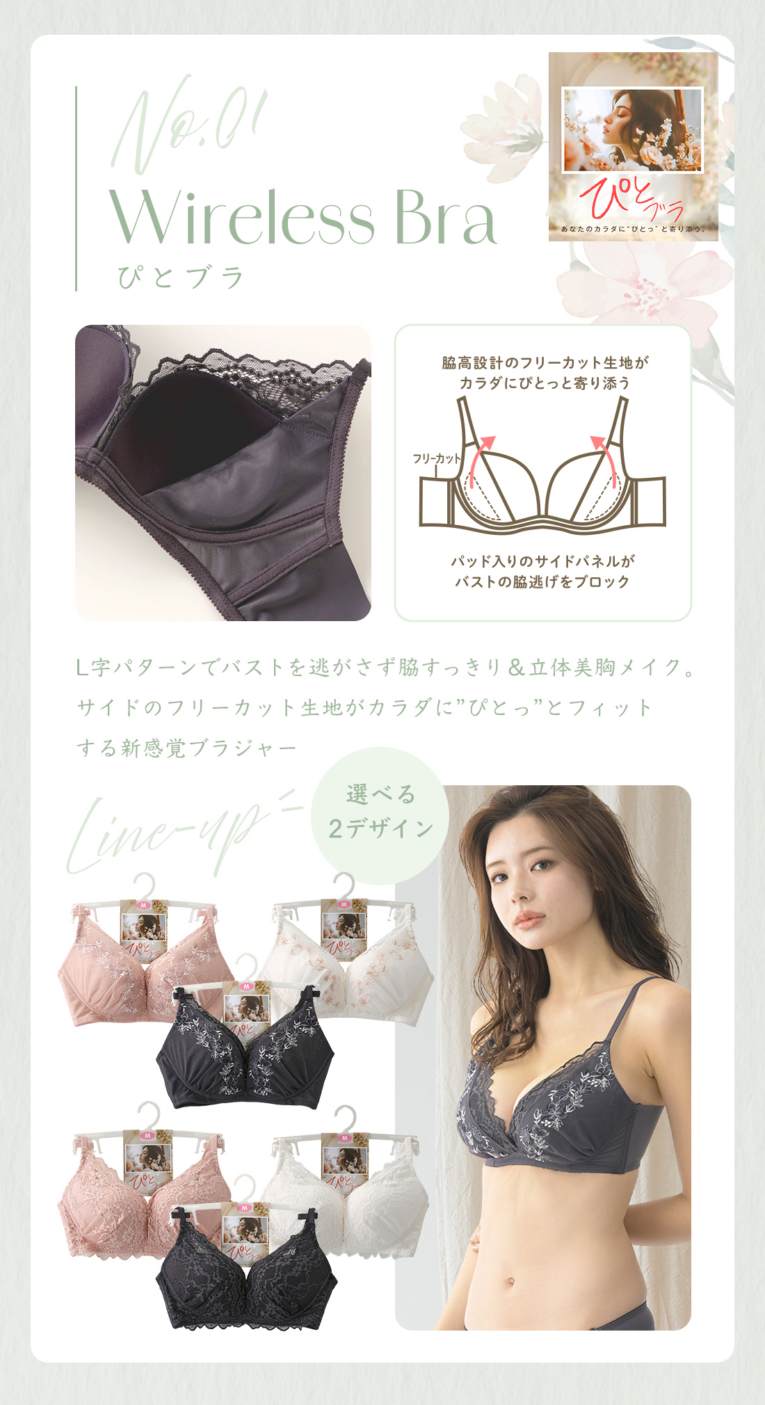 ~L字パターンでバストを逃がさず脇すっきり&立体美胸メイク。サイドのフリーカット生地がカラダに”ぴとっ”とフィットする新感覚ブラジャー~