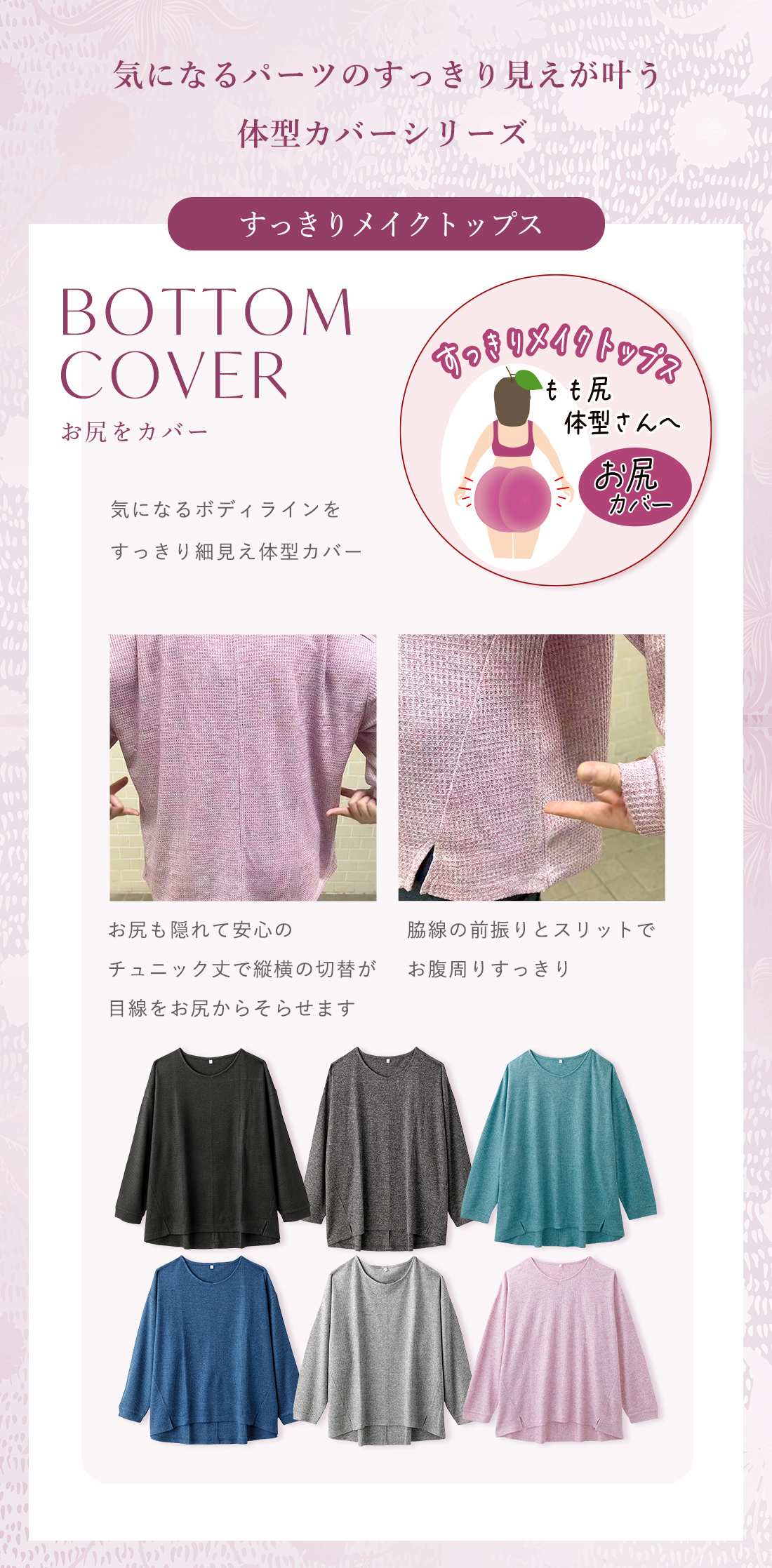 ~背中からお尻にかけての縦横切替とお尻が隠れるチュニック丈で後ろ姿すっきり。サイドの斜め切替と裾スリットでお腹まわりすっきり。~