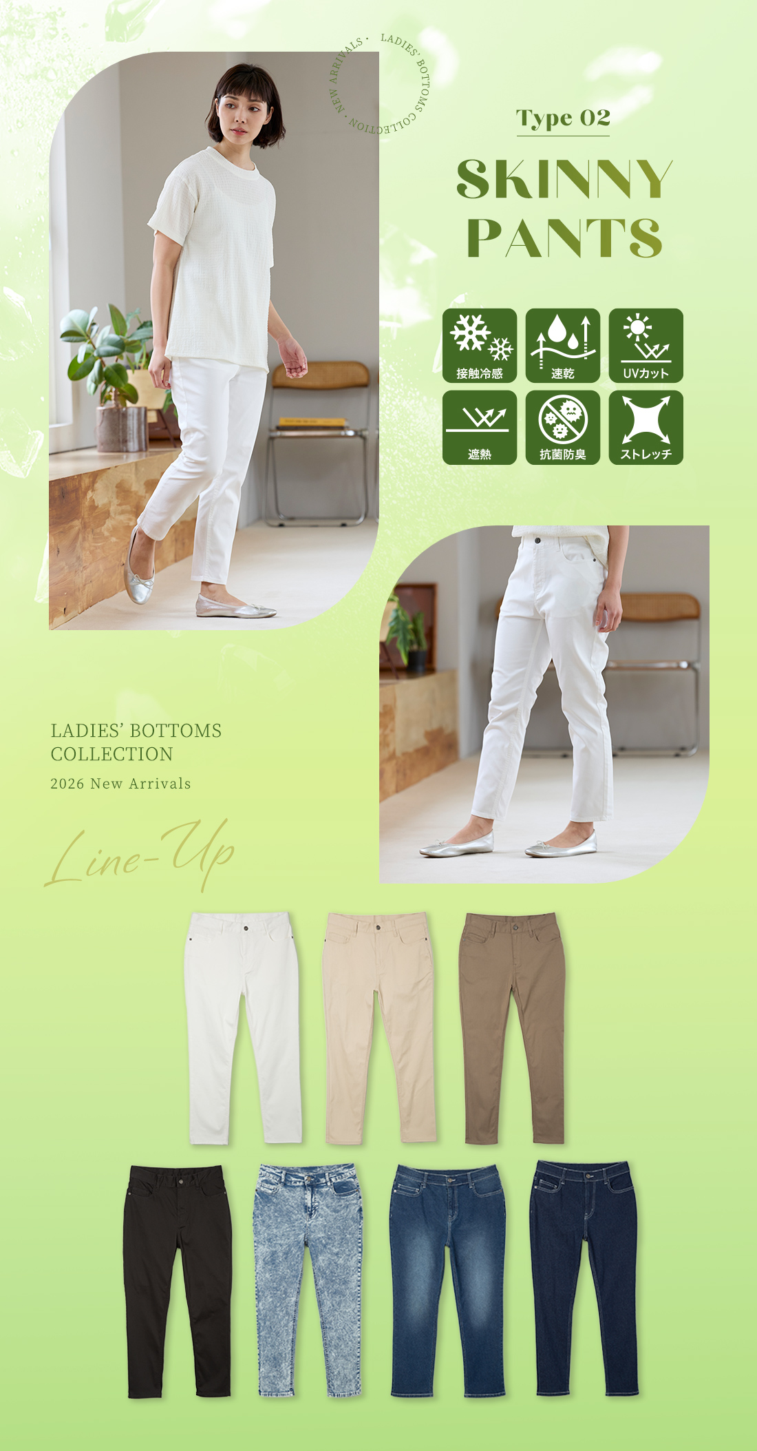~パシオスの大定番、夏ボトム~【SUFFUSE】【今風カジュアル】ICE ACTIVEレディース冷感ボトム スキニーカラー:オフクロベージュモカサックスブルーインディゴサイズ:61・64・67・70・73商品番号:43-561-240-01~43-571-240-01~