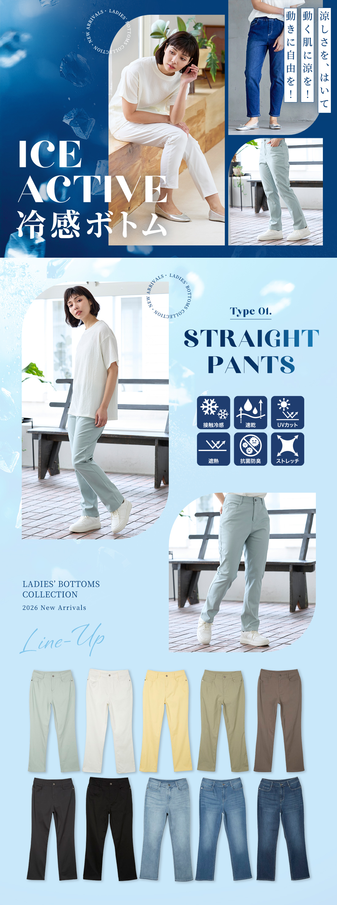 ~パシオスの大定番、夏ボトム~【SUFFUSE】【今風カジュアル】ICE ACTIVEレディース冷感ボトム ストレートカラー:オフクロカーキチャコールイエローミントモカサックスブルーネイビーサイズ:61・64・67・70・73商品番号:43-561-820-01~・21~・41~43-571-820-01~