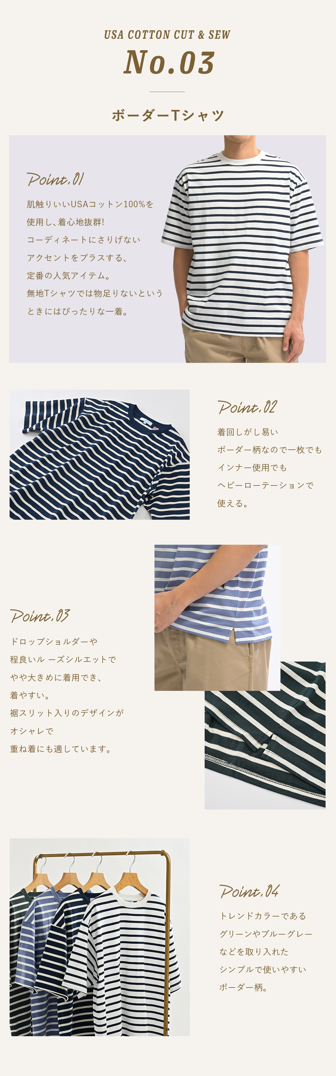 ~肌触りいいUSAコットン100%を使用し、着心地抜群!使い勝手の良いボーダー柄なので一枚でもインナー使用でも使える~