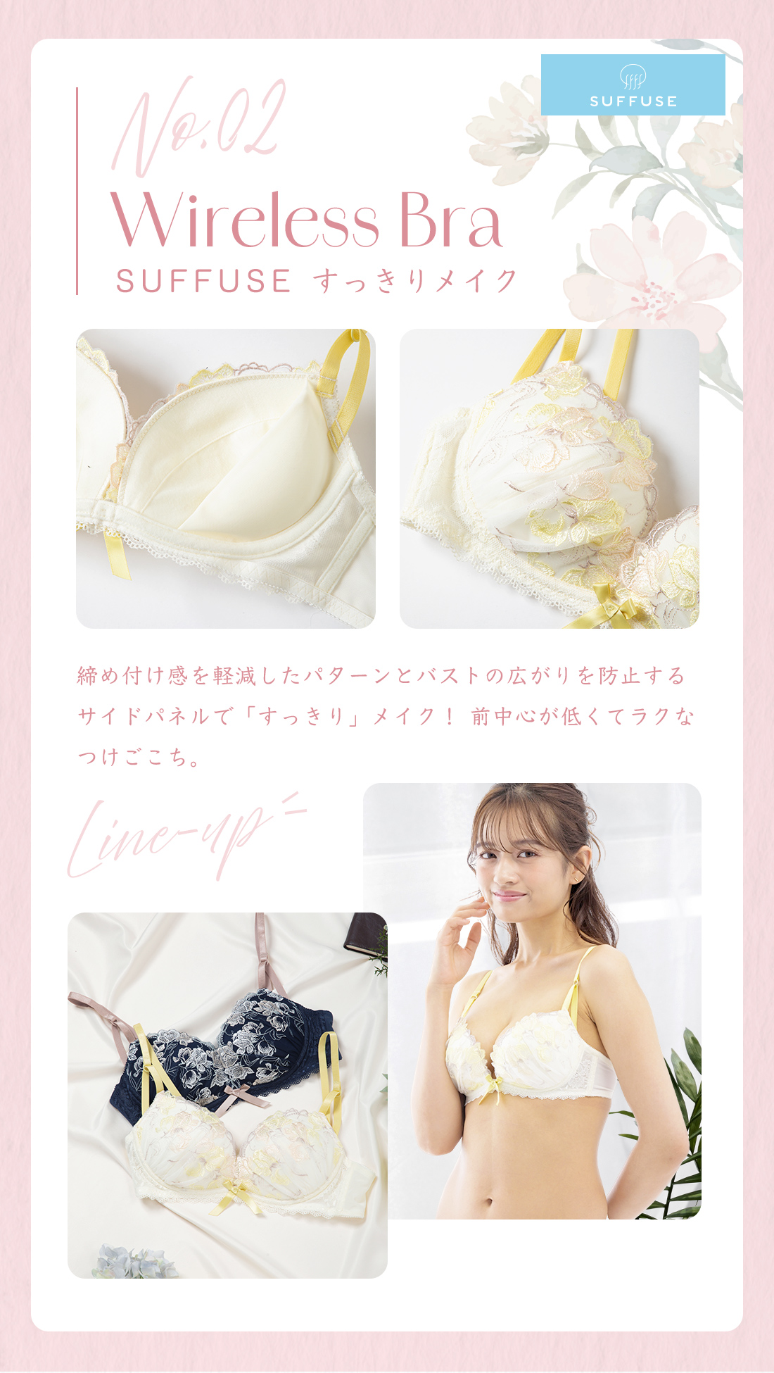 ~締め付け感を軽減したパターンとバストの広がりを防止するサイドパネルで「すっきり」ボディメイク~【SUFFUSE】【今風カジュアル】①(すっきりメイク)(寄せあげパッド入り)レディースノンワイヤーブラジャー②ペアショーツサイズ:M・L商品番号:72-520-051-01~