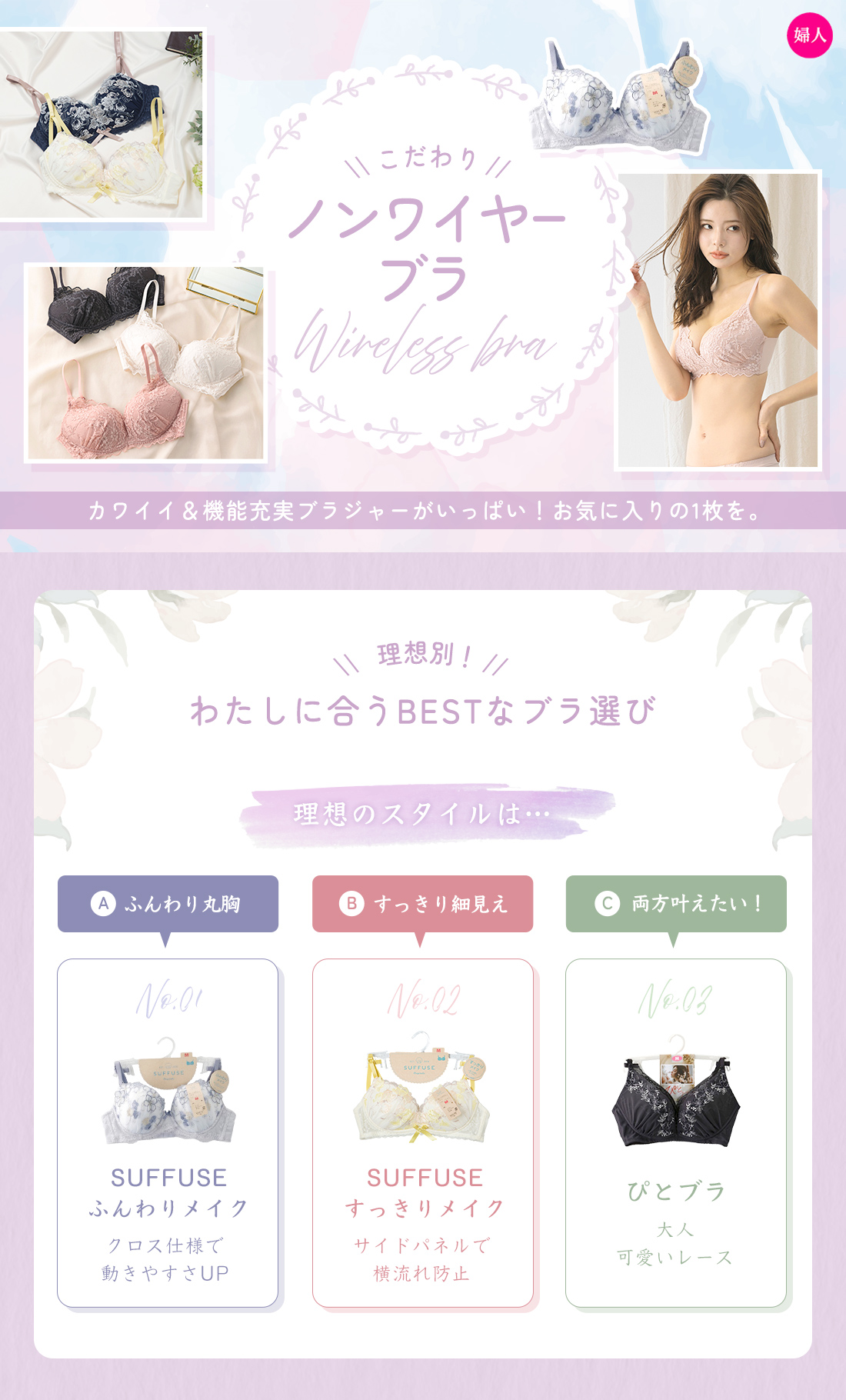 ~パワーネット内蔵で「ふんわり」まあるくバストメイク~【SUFFUSE】【今風カジュアル】①(ふんわりメイク)(内側パネル内蔵)レディースノンワイヤーブラジャー②ペアショーツサイズ:M・L商品番号:72-520-052-01~