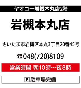 〒339-0058 埼玉県さいたま市岩槻区本丸3丁目20番45号 ヤオコー岩槻本丸店2階 Tel:048-720-8109