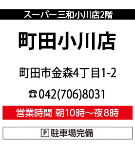 〒194-0012 東京都町田市金森4丁目1-2 スーパー三和小川店2階 Tel:042-706-8031